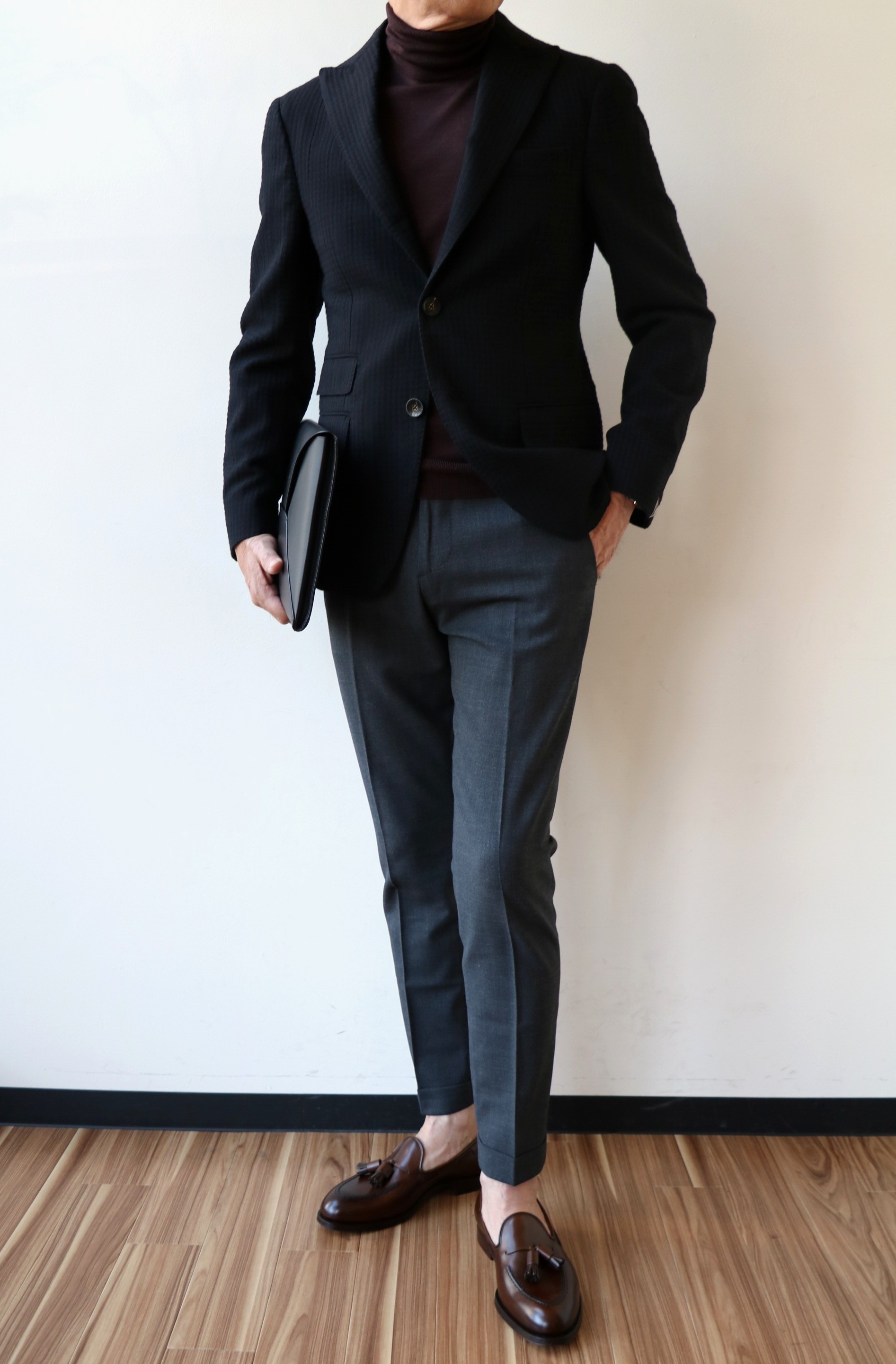 こんな着方もありです。インナーに使ったのは、Settefilli Cashmere(セッテフィーリカシミア)の立ち襟ヘンリーネック。色を使わない組み合わせが好きなだけに、ついつい同系色で合わせてしまいますが、季節が進めば、パンツを白に替え、インナーに赤のポロニットを合わせようかと秘かに企んでおります。