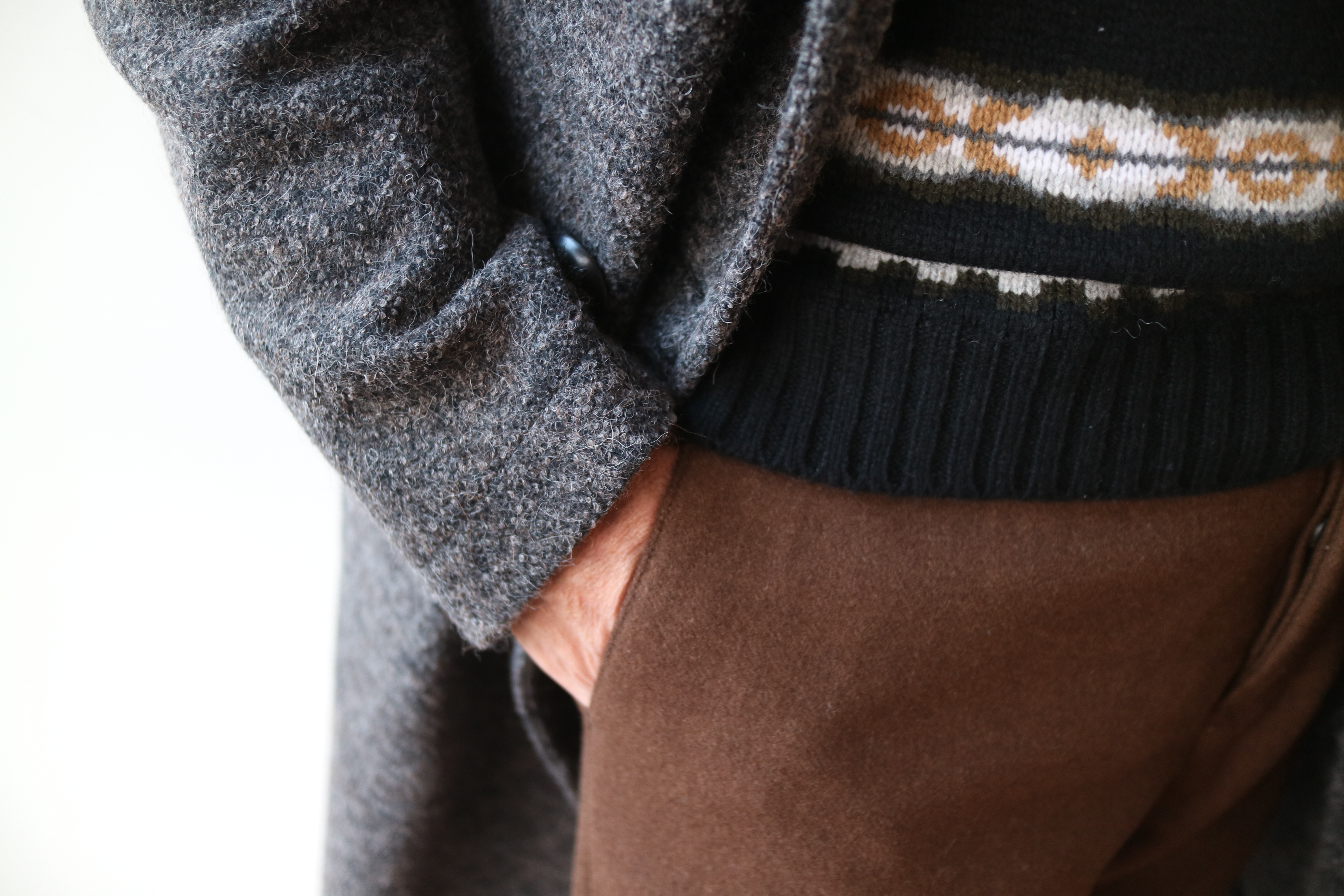 グレー、ブラウン、ブラックの濃淡で織り成すウール・アルパカの温かみのある生地感。公園の散歩だけではなく、荒涼とした冬の海辺にも似合いそうです。