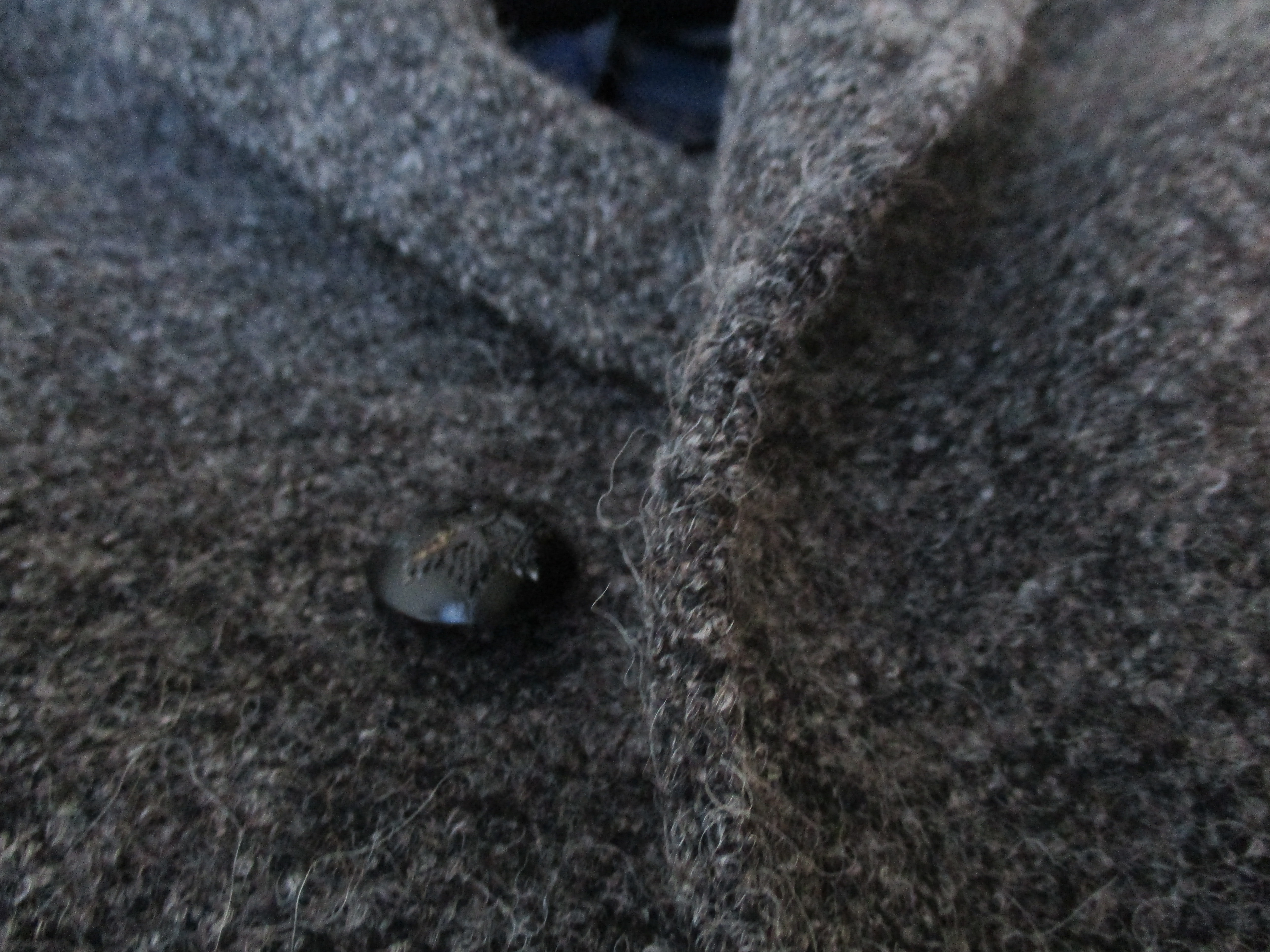 ウール100%のブークレ調に付いた釦は、メタル風のウッド釦。ころっとした愛嬌のある表情を作り出しました。