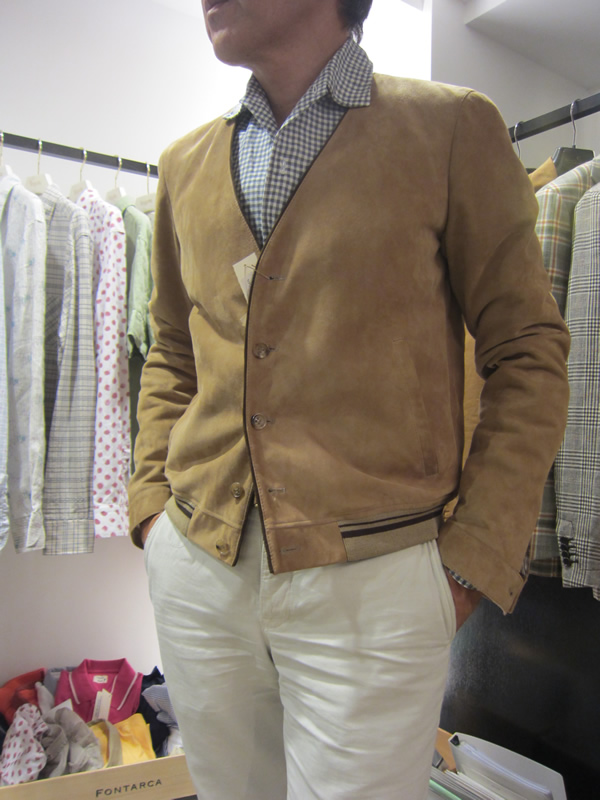 リネン100%の裏地も素敵です。カーディガン感覚で羽織ることのできる最もリラックスしたスエードブルゾンです。