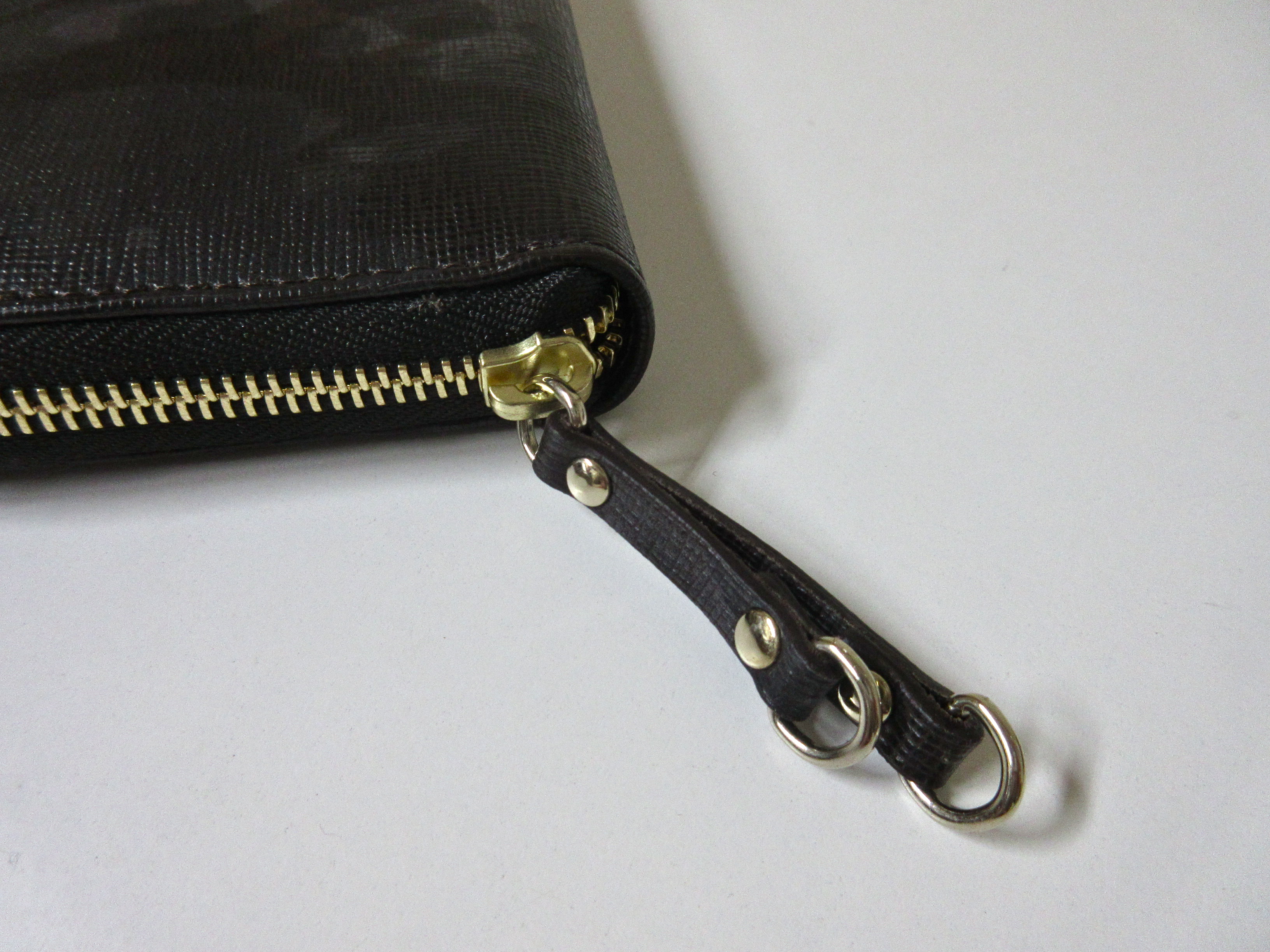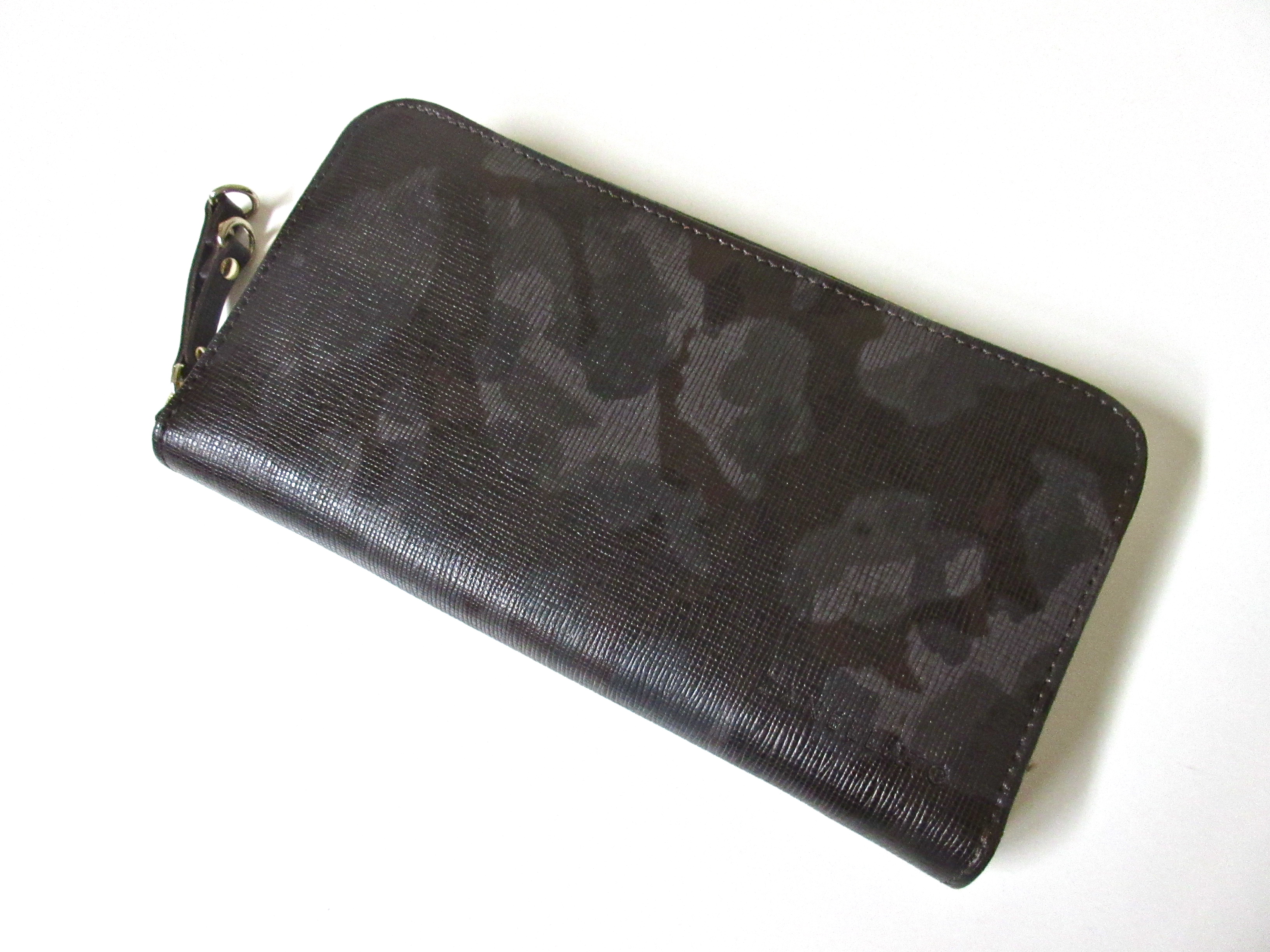こちらは、以前ご案内したサフィアーノのカモフラ柄シリーズから登場した、ラウンドジップのロングウォレット。某高級メゾンも好んで採用しているサフィアーノ素材は、縦縞が入った型押しと、メタリックなツヤと張りのある肌触りが特徴です。