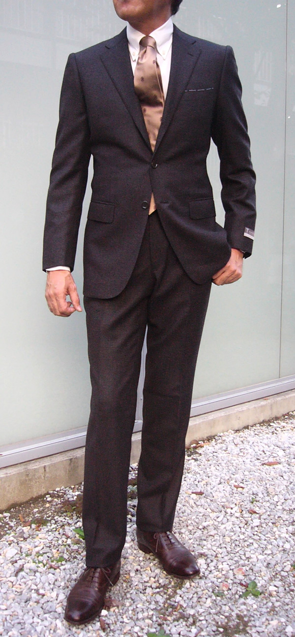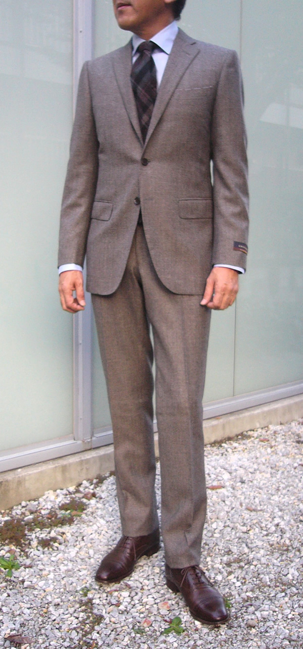 そして、イタリア【ESTRATO】社のマイクロハウンドトゥース柄のグレースーツ?に見えるのですが、よーく見ると縦にブラウンの糸が入っていて、何とも独特な色合いです。
