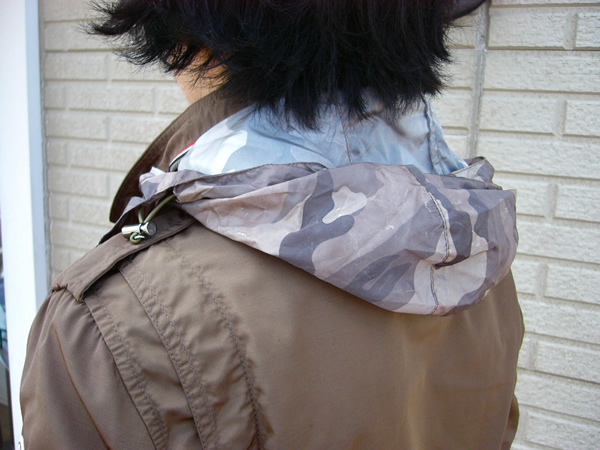 そして、 "大人"の遊び心は背後に潜んでいました。首元には収納式のフードが隠れていて、取り出すと、何とカモフラ柄が。このぐらいの控えめなカモフラなら、常に出しておいても面白いですね。