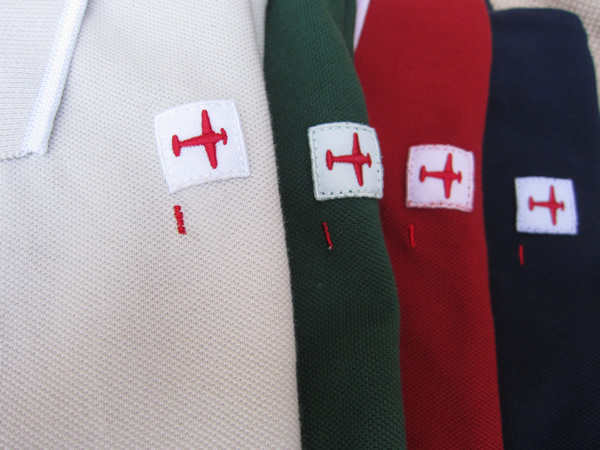 飛行機がトレードマークの【AVIO】。マークの下の刺繍は、サイズを表します。一本の場合は、Sサイズ。二本はM,三本はL。刺繍の無いのがXSサイズになります。こんなところにも、このブランドの遊び心があって、私たちを楽しませてくれます。マークの付いている場所もユニークで、第一釦を閉じた状態で測ると、襟から3cm、袖付けから6cmの位置に付いています。やけに詳しいですねの声に、実は一点、マークを付け忘れた物があり、付ける為に測ったのです。これも、イタリアモノならではの愛嬌です。