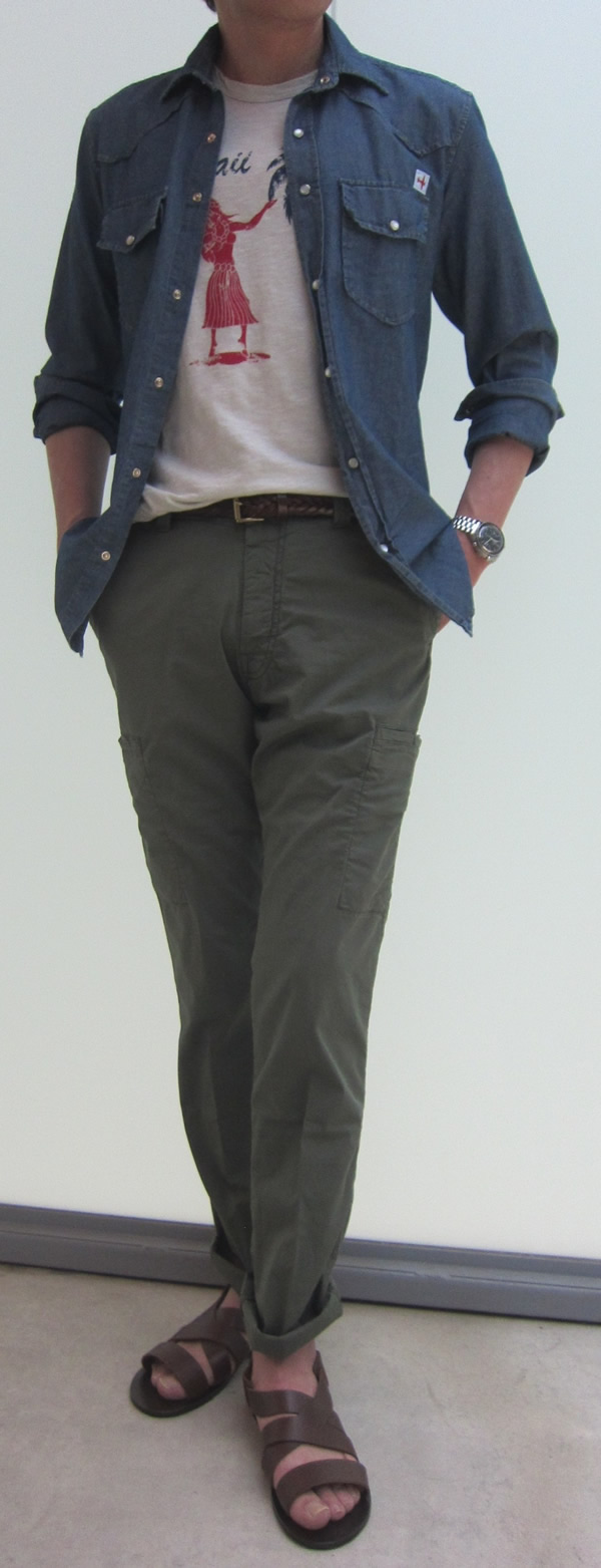 折角ですので、ツーカーの仲、J.W.BRINE(ジェイダブリューブライン)のマチなし・細身カーゴ「DRAKE」を穿いてコーディネートしてみます。