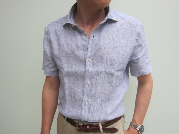 こちらは、リネン100%のミニストライプ。こちらも割り切るなら、夏に大活躍のシャツになることでしょう。