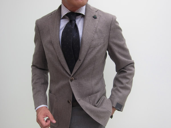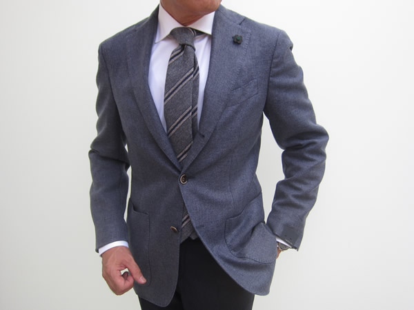 モデルは身長175㎝、体重64㎏、胸囲91㎝でサイズ44を着用しております。通常、サイズ46を着ますが、生地がしなやかな為、44でも窮屈に感じません。合わせたシャツはBARBA(バルバ)、ネクタイはFRANCO BASSI(フランコ・バッシ)、パンツはINCOTEX(インコテックス)、靴はFERRANTE(フェランテ)の「SCALA」、バッグはもちろんCISEI(シセイ)です。