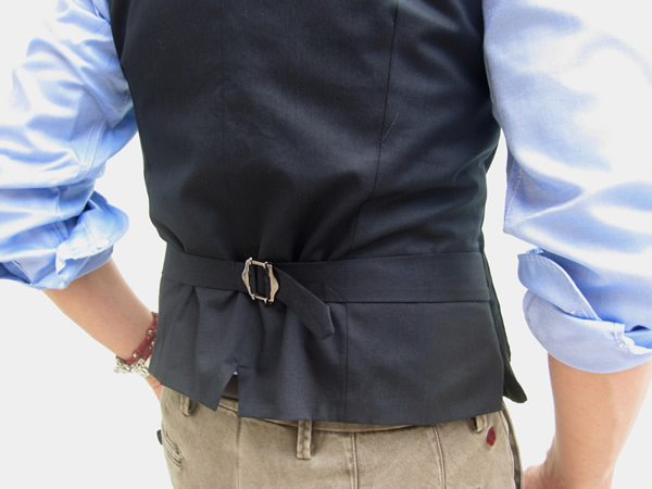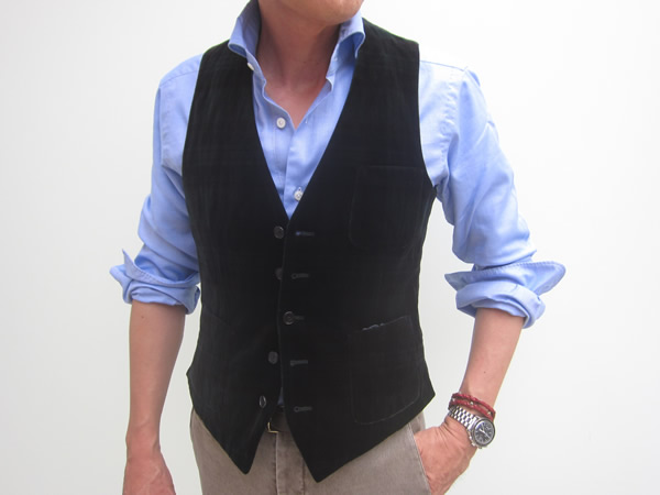 以前ご紹介した別珍ジレが両脇のウエルト・ポケット(箱ポケット)に対して、こちらは3つのパッチポケット。よりカジュアルな仕様になります。