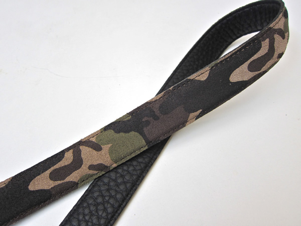 ウレタン素材にカモフラージュ柄をプリントしたものを、シボ革に貼付けた凝ったデザインです。素材に表情があって、使い込む度に出てくるアタリの風合いにも期待してしまいます。
