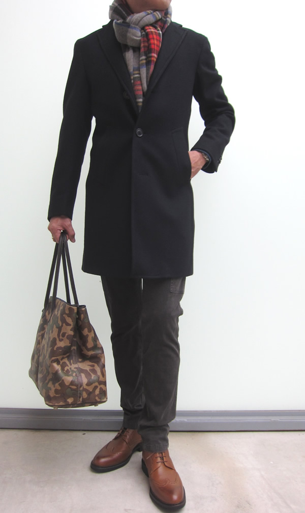 モデルは身長175㎝、体重63㎏、胸囲91㎝でサイズ44をややタイトに着ております。こちらもインナーはシャツのみです。合わせたパンツはSOLID(未公開)、マフラーはALTEA(未公開)、靴はParaboot、バッグはもちろんCISEI(私物)です。