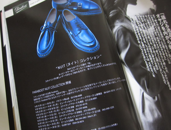 右の写真とフレーズに目がいきますが、左ですよ。「LEON11月号」のP347に掲載されている【Paraboot(パラブーツ)】の”NUIT(ヌイト)コレクション”の広告です。NUITとはフランス語の「夜」。夜をイメージしたネイビーカラーの新作モデルや2012年秋冬コレクションを数多く取り揃え、トランクショーを開催いたします。