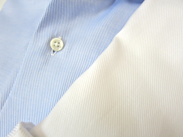 鮮やかなホワイトベースのシャツに、明るいブルーのラインを引いています。敢えてコメントをするまでもなく、汎用性の高い万能シャツです。