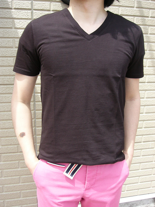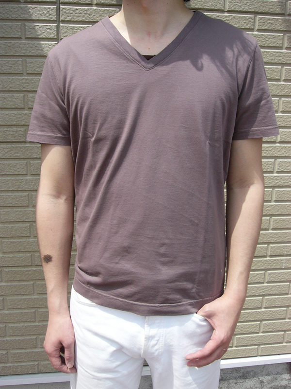 以前のモデルは、クルーネックにも見えるぐらい浅いVネックでしたが、こちらの深Vは、Vの切れ込みが鋭角になって、よりモードな雰囲気を出したモダンな型になりました。