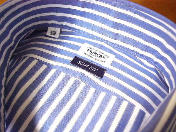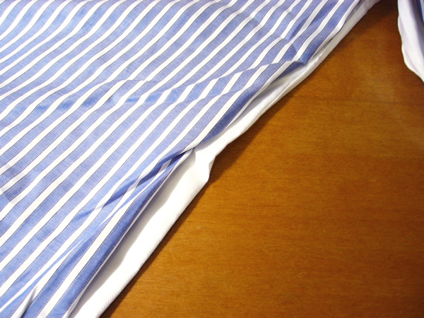 ブルーのストライプシャツが「SLIM-FIT」モデルで、下に重ねたホワイトシャツが旧モデル。重ねてみると一目瞭然でした。