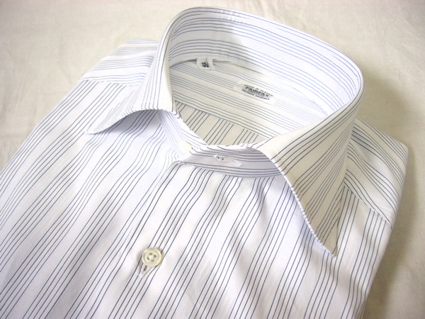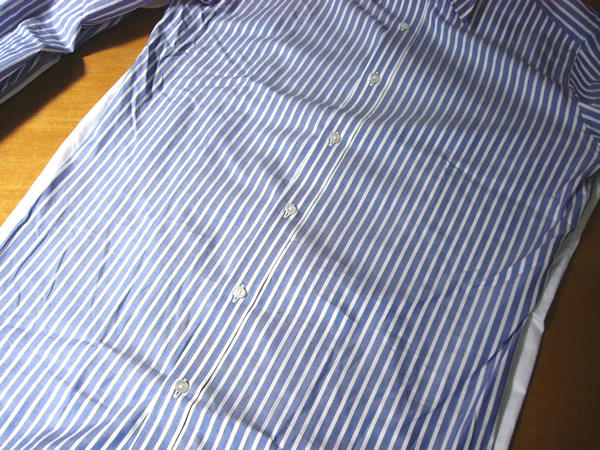 細かいピッチのストライプで、よりシャープな印象を与えてくれる柄です。色も、イタリアらしく発色の良いビビットなブルーで、生地のハリ・ツヤ共に申し分無く、色気のあるシャツに仕上がりました。