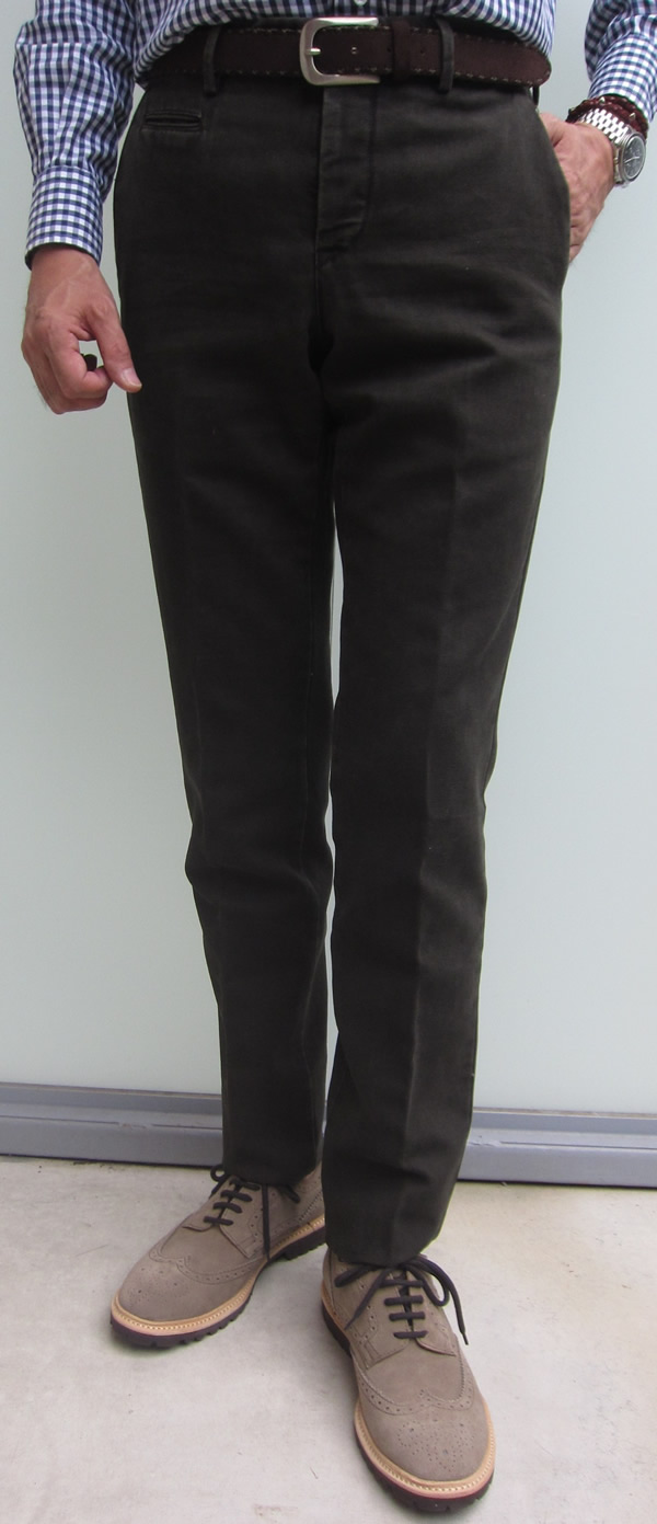 モデルは身長175㎝、体重63㎏、胸囲91㎝でサイズ44を穿いております。合わせたジャケットはCARUSO(未公開)、シャツはBARBA、ニットはJOHN SMEDLEY(未公開)、ベルトはAnderson's、靴はDOUCAL'S、バッグはZANELLATOです。