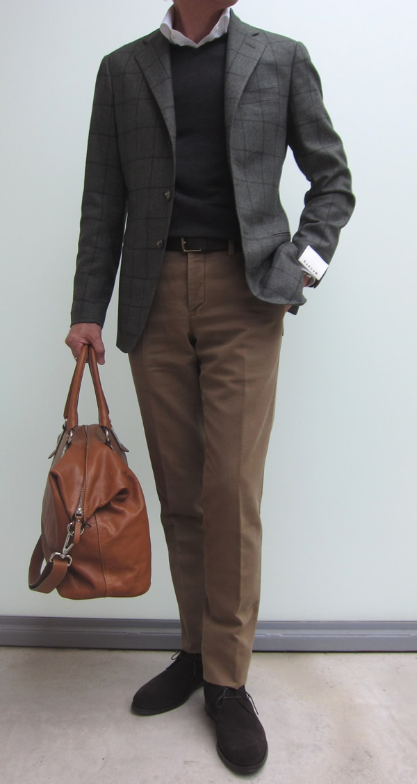 先日ご紹介させていただいたHERNO(ヘルノ)の「OXFORD」ショートコートにも合わせていますので、参考にしてください。合わせたコートはHERNOのショートコート、ニットはJOHN SMEDLEY(未公開)、シャツはMASTAI FERRETI(未公開)、靴はDOUCAL'S、バッグはFelisi(未公開)です。