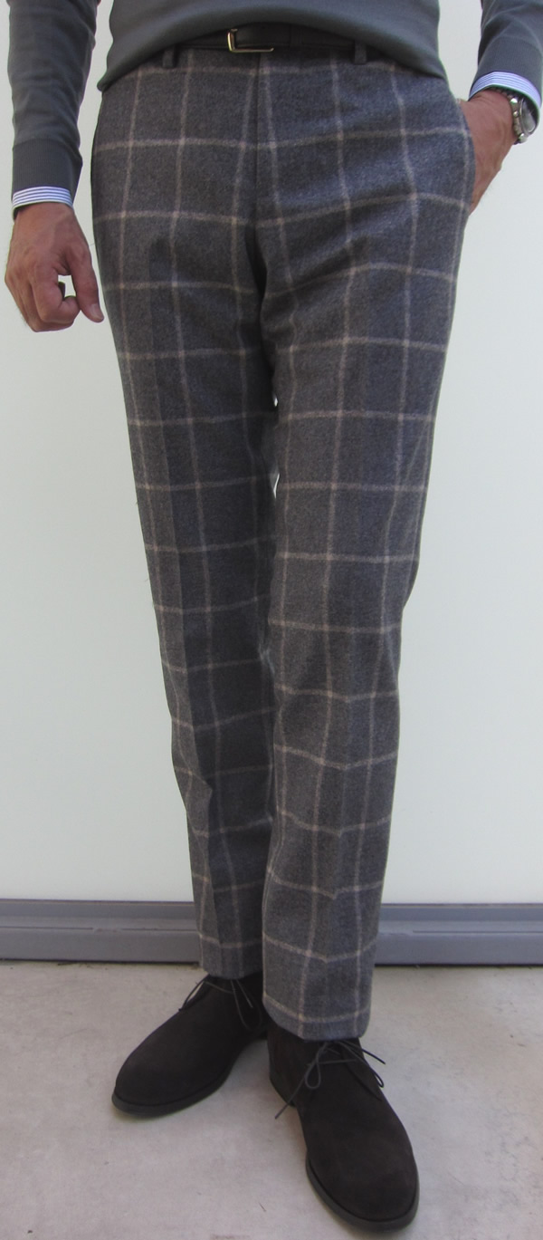 SUPER110'SのVERGIN WOOLは、柔らかい風合いを持ちます。ミディアムからライトの中間グレーベースにベージュのウインドペインは、無地よりも表情を優しげに見せてもくれます。正にグレージュの組み合わせに最適なパンツ。コントラストを付けるのもいいですが、同じトーンでまとめ上げると上品でエレガントな雰囲気になります。
