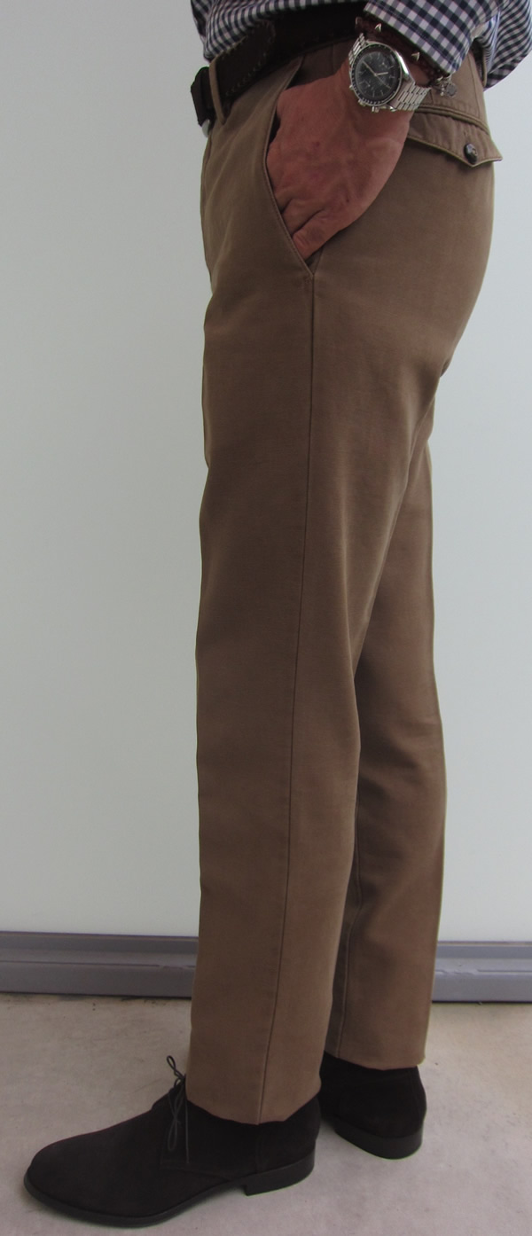 打ち込みのしっかりしたコットン100%のパンツは、珍しく横に織柄が入ります。とても柔らかく質感のある生地に秋冬らしい深みのある色、タバコブラウンとダークオリーブがマッチします。