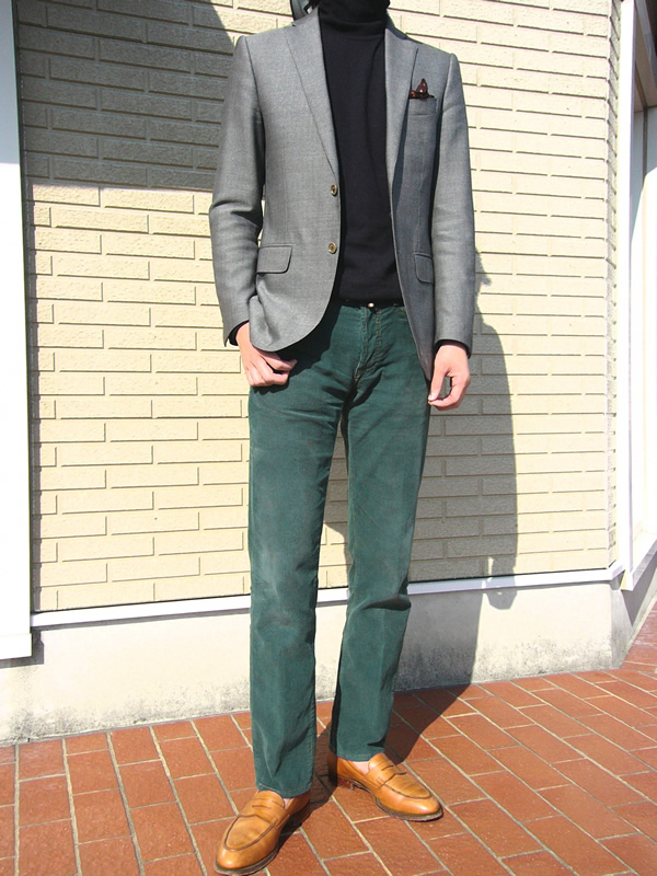 勿論、私も購入させてもらいました。こちらは自前のグリーンです。パンツでは、なかなか馴染みの無い色ですが、一目惚れし穿いてみて即決しました。組み合わせしやすいので、コーディネートの万能選手として一番登場回数が多く、私のワードローブではエースで4番的な存在です。