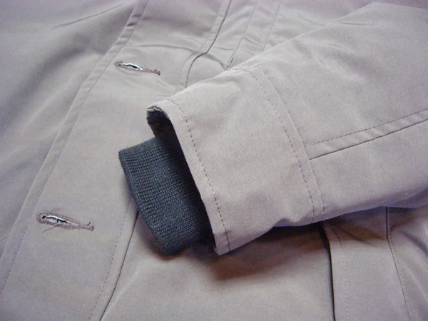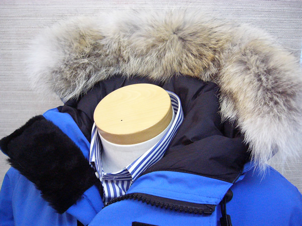 上品でエレガントなコヨーテのファー。袖のリブは手首にしっかりとフィットして、袖口から浸入する外気をシャットアウトすることで、中の温度を保っている。釦は、糸で縫い付けるのではなく、太いテープを通しその両サイドをミシン縫いにしています。簡単に取れてしまう従来の糸縫いより、高い強度を発揮します。