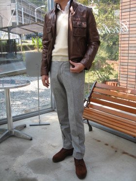 非常に男くささのある独特なデザインですが、ウールのパンツやスラックスで知的でキレイめなイメージにコーディネートしてもいいですね。