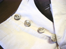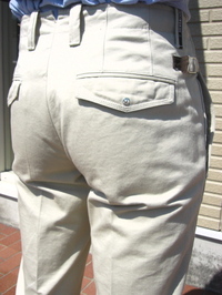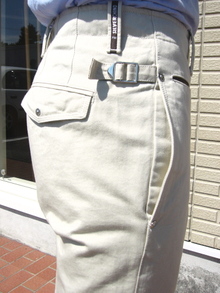 ご覧のように、ウエストのベルトループに「SILVER CINO」の帯が付き、その下にはサイドアジャスタが付いています。そして、フロントの水牛釦も、これだけの厚みとツヤならば、価値ありです。