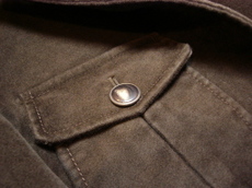 釦は、特注品。マーブル模様の石(石の名前が分からないので調べておきます)を入れたヴィンテージ風。洗いをかけて、色むらがあったりシワが寄ったりと、ラフな雰囲気がとってもいいですね。