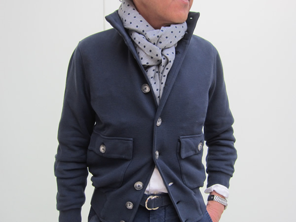 もう一色、ネイビーもご用意しております。こちらも製品洗いをしているため甘い色目です。ボトムは、ホワイトやベージュ、またはカーキなどと合わせても良いのですが、ネイビーのパンツを持ってきて、トーン・オン・トーンでコーディネートするのが今の気分です。首に巻いたアルテア(ALTEA)のストール、わざと赤いロゴを見せてアクセントにしています。