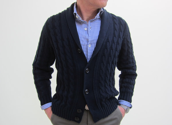 これからの季節、ちょいっと出かけるのに便利なショールカラーカーディガンは持っておきたいアイテムの一つです。特にケーブル編みは伸縮があり動きやすく快適です。色目もネイビーなのでコーディネートを選びません。
