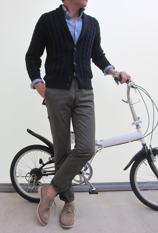 モデルは身長175cm、63kで44を着用しております。本来なら、着丈が短くなるのを足の長さでカバーしております(失礼しました)。合わせたシャツは、同じく【Drumohr(ドルモア)】のものです。パンツは、入荷したばかりのPT01の「Editor」、足元は大人気のドゥーカルス(DOUCAL'S)の「DAINO」です。自転車は私物で、お売りできませんのであしからず。