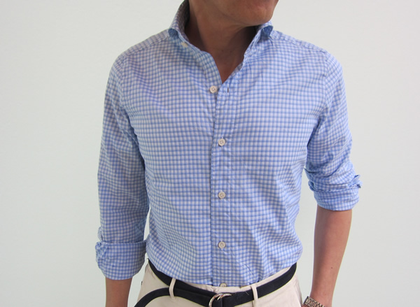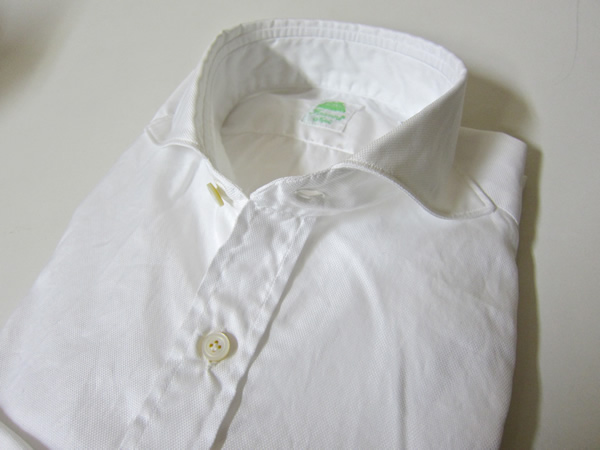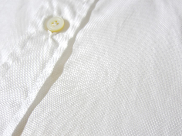 夏シャツの王道と言えば、やっぱり白シャツです。生地は、堅過ぎず砕け過ぎず、やや光沢があって上品な風合いのピンオックスフォードを選びました。