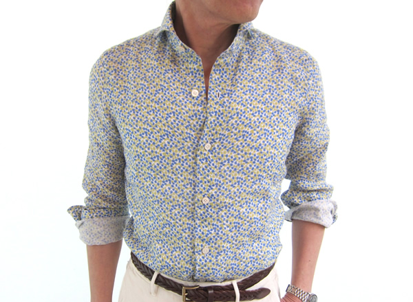 リネン100%の生地には適度にシワが寄って、いやらしさなんて微塵も(?)感じさせない男の夏シャツです。一枚で着ても活かすことのできるシャツですが、敢えてジャケットのインに合わせコーディネートのアクセントとして見せるのも良いですね。