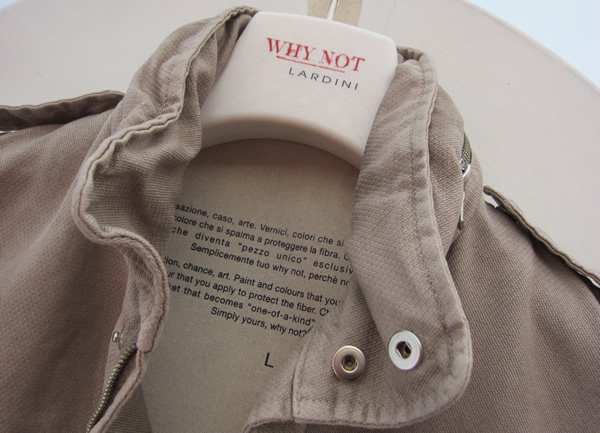 ハンガーとハンガーに巻きつけられたイタリア語と英語で書かれた布が目を惹きます。『WAY NOT』とは、「なぜいけないのか、なぜしないのか」、「~してはどうかね」、「よかろう、そうしよう」など様々な意味がありますが、この場合、try it on?をつけて「着てみない?」が正しいのかな思います。