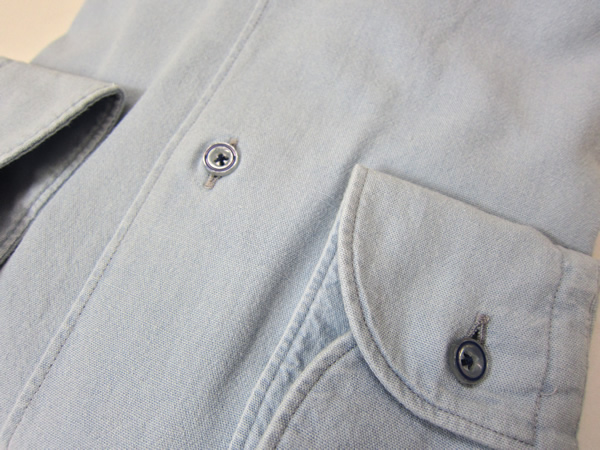 色落ちをさせたインディゴシャツ数あれど、ここまで淡い色はあまり無いのでは。絶妙なウォッシュ感と、微妙な色出しが織り成す見事なシャツ。