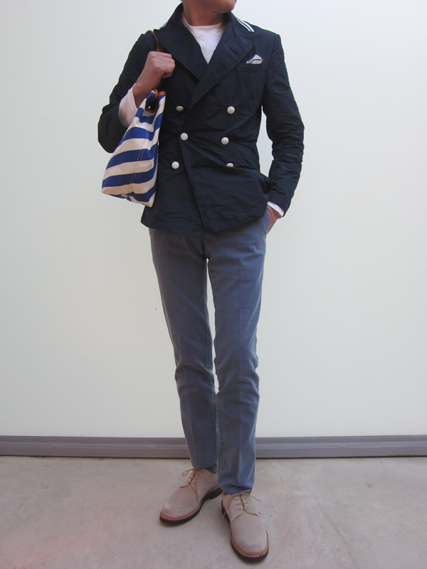 モデルは身長175cmでサイズ46を着用しております。ジャストサイズですね。合わせたボトムは、どちらも【PT01】の「PALM BEACH」です。