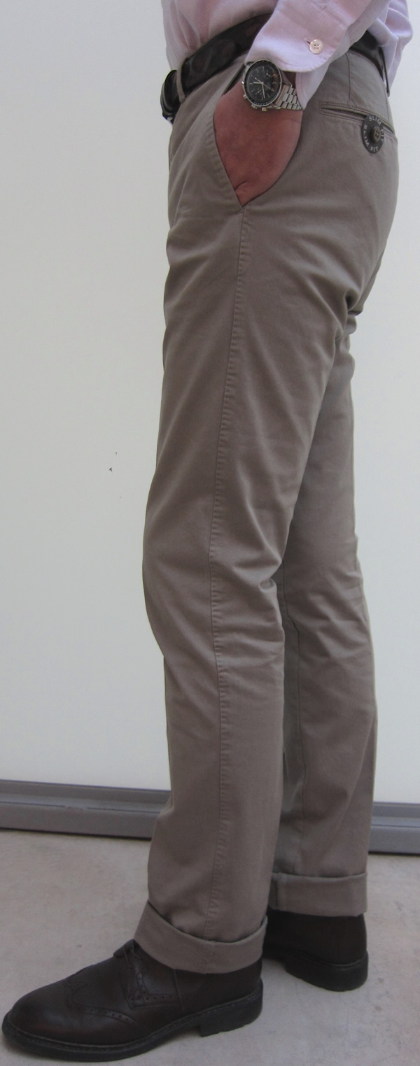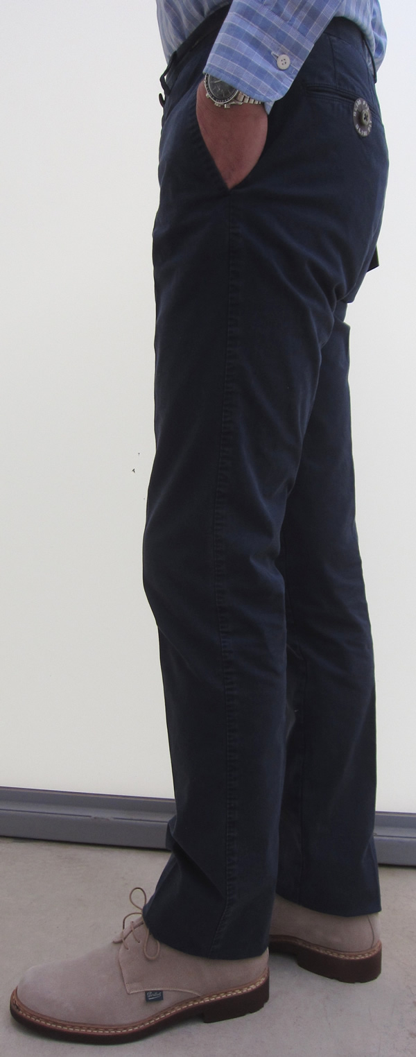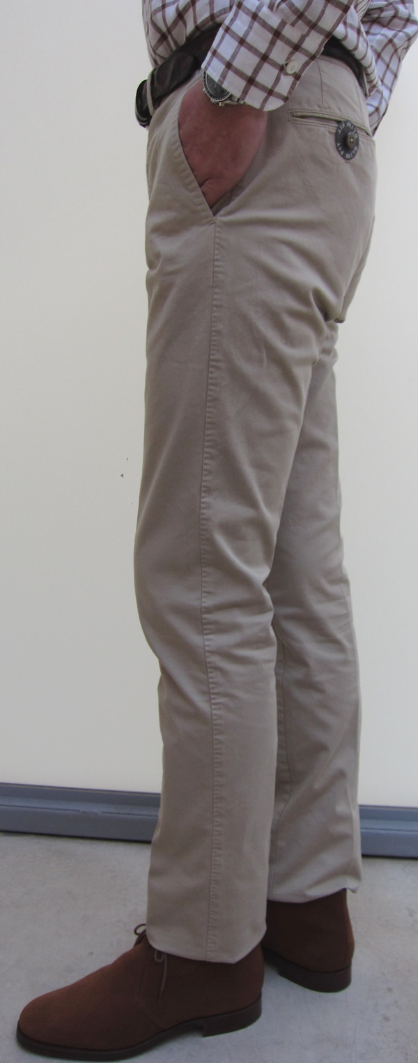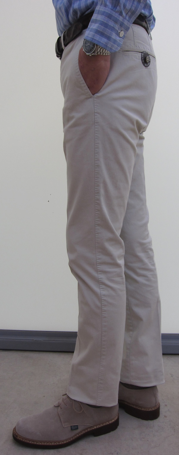 カラーは、右からオフホワイト、ベージュ、オリーブ、ブルーの4色です。「Business」ラインは、SLIM FIT(スリムフィット)のモデルですが、洗いのせいか従来より細身に仕上がっております。SUPER SLIM FITにより近い感じです。細身のモデルを好まれる方にとっては、選択の幅が増えますね。ストレッチも利いていますので、ストレスは全くありません。