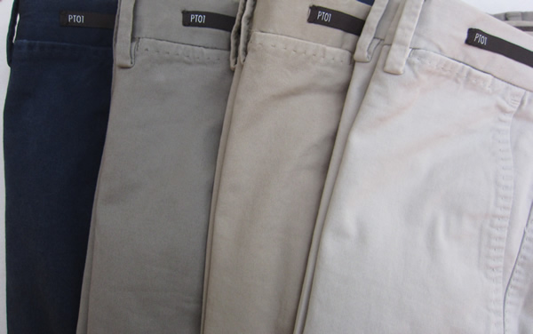 そして本日のメインは、こちら【PT01(ピーティゼロウーノ)】の「Business」ライン。最も使いまわしの利くライトウエイトのチノパンツです。今回、ストレッチ素材でセレクトしました。春から夏を通し秋まで大活躍するはずです。