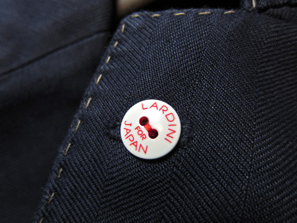裏には「LARDINI FOR JAPAN」と書かれていました。いつもならジャケットの色に合わせていましたが、一緒に入荷したサファリジャケットもこの配色です。震災復興への熱いエールに感謝です!!