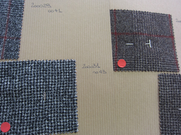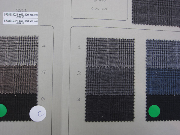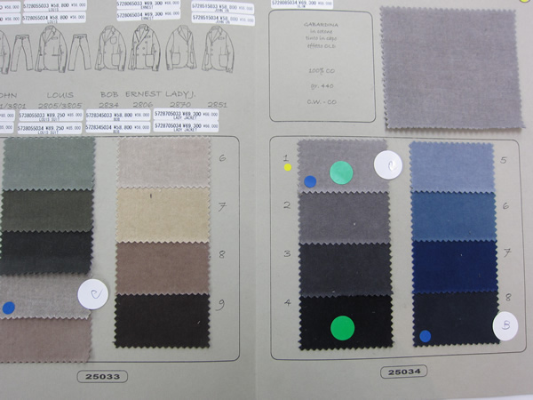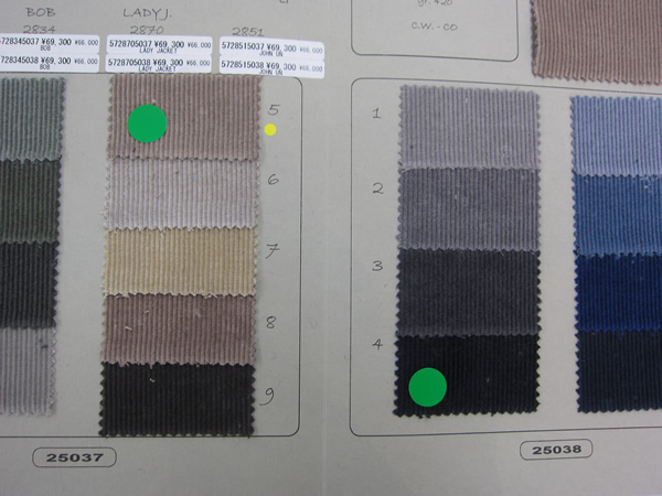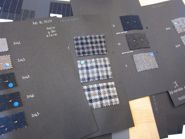 グリーンのシールがオーダー分です。これらのジャケットが5、6万円台で店頭に並びます。また来シーズンからスリムフィットが登場しますので、更にファンが増えそうです。