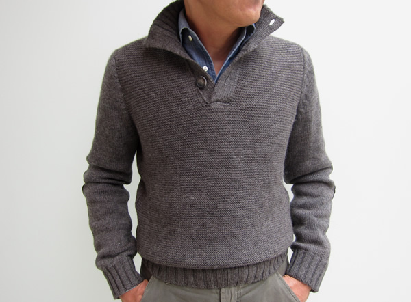 もう一色は、ナチュラルなグレイッシュブラウンとは対照的なブラックを選びました。ネイビーと迷ったのですが、デザイン、素材、そして編み方を見ているとブラックのイメージが沸いてきたのです。色を選ぶ際の基準は、自分の好きな色であることはもちろん、後は直感です。ただ、ブラックには敢てエルボーパッチを付けていません。
