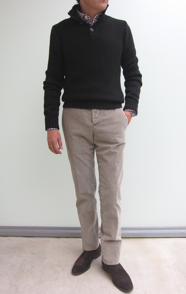 昨日に続き、【SCAGLIONE(スカリオーネ)】のニットと入荷したばかりの【PT01】のコーデュロイパンツ、さらに【GLANSHIRT(グランシャツ)】の3本立てでご紹介させていただきます。