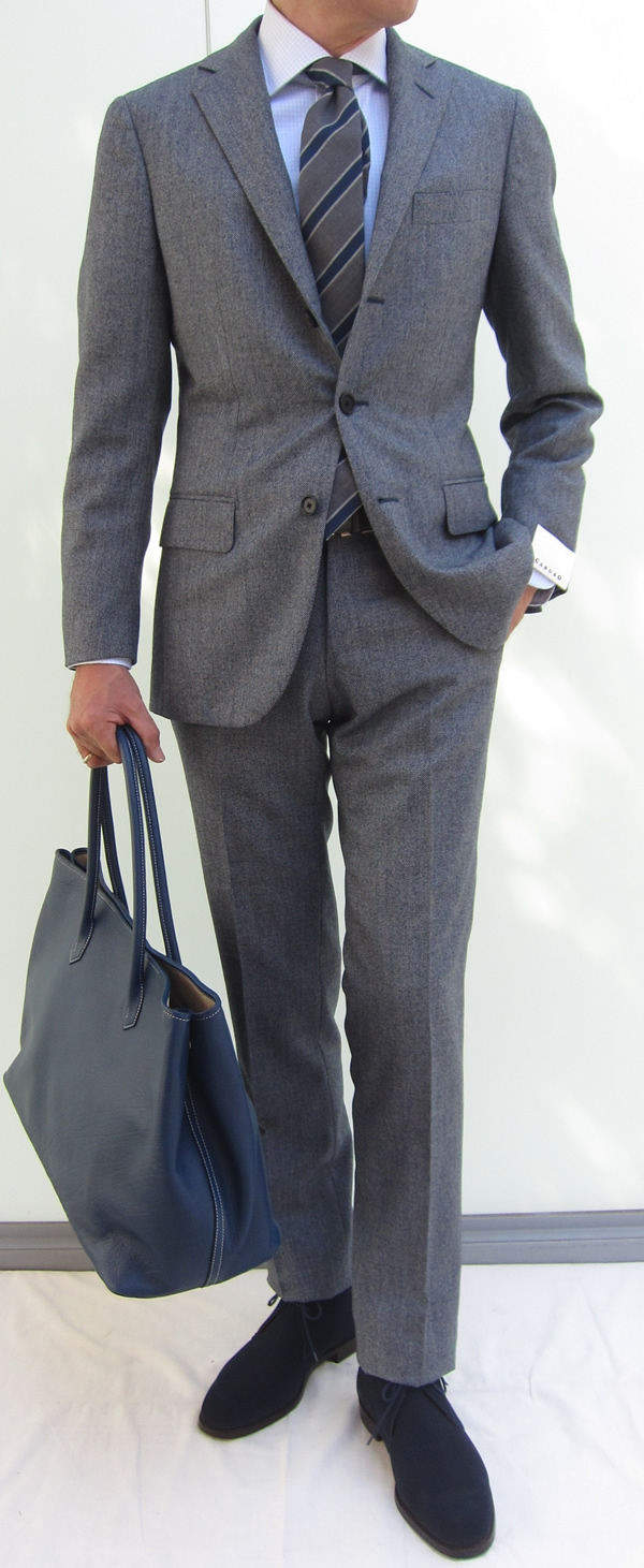 展示会で、このブルーのサンプルを見て、一目ぼれです。ブルーのバーズアイって、今まで見たことがありません。決して派手でなく、かといって地味でもなく、このさじ加減が絶妙なんです。今回の購入スーツは、これかなって、秘かに決めてたりして・・・。折角ですので、ブルーで統一してみました。足元は、【CROCETT&JONES】の「CHERTSEY」。手に持った鞄は、【CISEI】のトートバッグです。