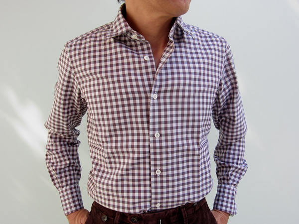 写真では分かりづらいかもしれませんが、ボルドー(縦)とグレー(横)のチェックになっています。ネル地ほど厚くなく、オッツクスフォードより少し厚めの生地を使用。上に着るものを選ばず、コーディネートしやすい色柄です。そして、このモデル「SEAN」は、日本人の体型にあわせられており、イタリアの工場で袖を3cmほどカットしています。