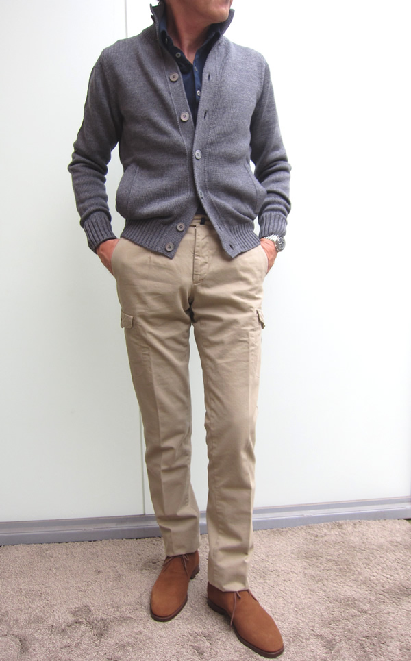 まずは、ミドルゲージのブルゾン型カーディガンです。コーディネートで合わせたパンツは、もちろん「スローウエア」グループ【INCOTEX(インコテックス)】の両ポケカーゴです。