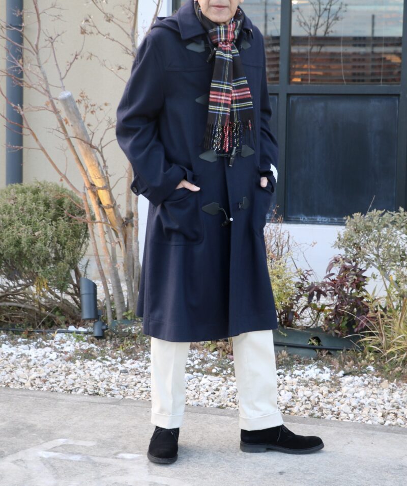 ネイビーのタイロッケンウールコートを持っていなかったら、間違いなく購入したであろうWhiteley&Green/ホワイトリーアンドグリーンのアーカイブフランネルカシミアリミテッドダッフルコート。幻のアーカイブ生地とご説明しているように、ヴィンテージ感溢れる風合いのダッフルコートです。ボディと一体型のダッフルと違い、フードが取り外しできるのも魅力です、それに、この面積で軽いというのが、最も重要な決め手になります。ホワイトのコーデュロイパンツが手に入った途端、さらに購買意欲が増してくるから、困ったもんです。