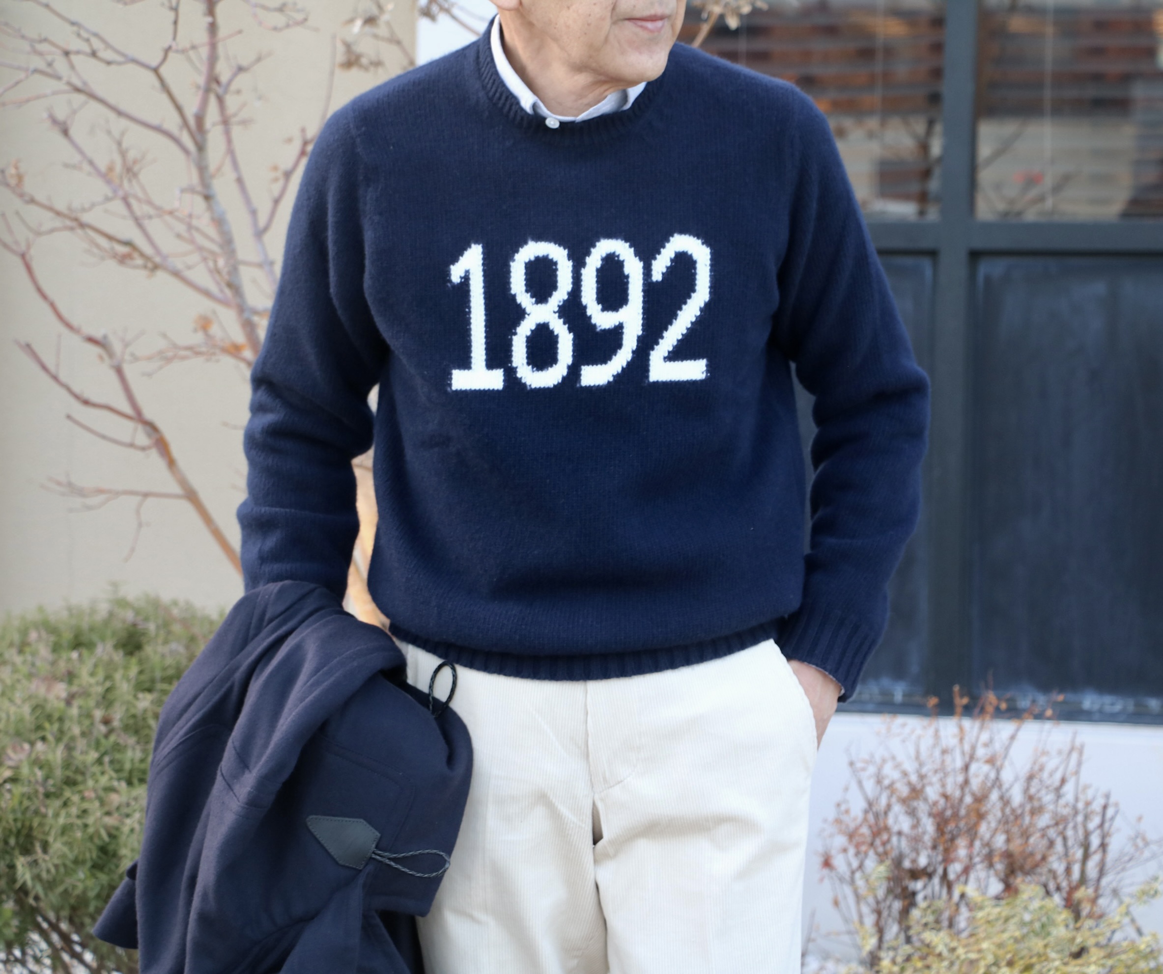 時々、カシェートブログのコーディネートに出てくる、このナンバー入りのクルーネックセーターは4plyウールです。もちろんCorgi/コーギーのもの。”1892″は創業年?いや、1893年ですから、一年異なりますが、ロンドンで打ち合わせした際、何か思惑があったのかもしれませんね。カシェートバイヤーに聞かないとわからないことです。