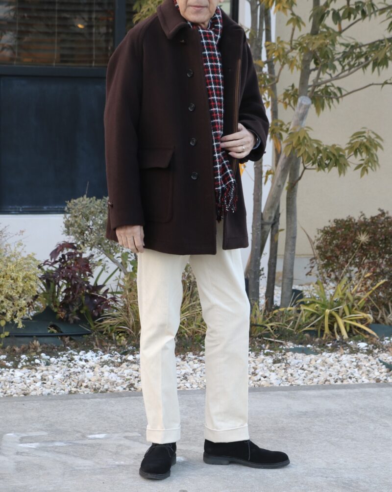 北風の吹く冷たい空気の中、カメラマンのナグラさんは震えておりましたが、さほど寒く感じないのは、選んだ服のせいです。ようやく、裾上げの修理から戻ってきたCORDINGS/コーディングスのコーデュロイパンツ。早速、穿いてみました。12月に風邪による断食で細くなったウエストが年明けの食欲旺盛で逆にややキツい。ウエストを少し出すか、痩せるかのどちらかでしょうか。余談でした。