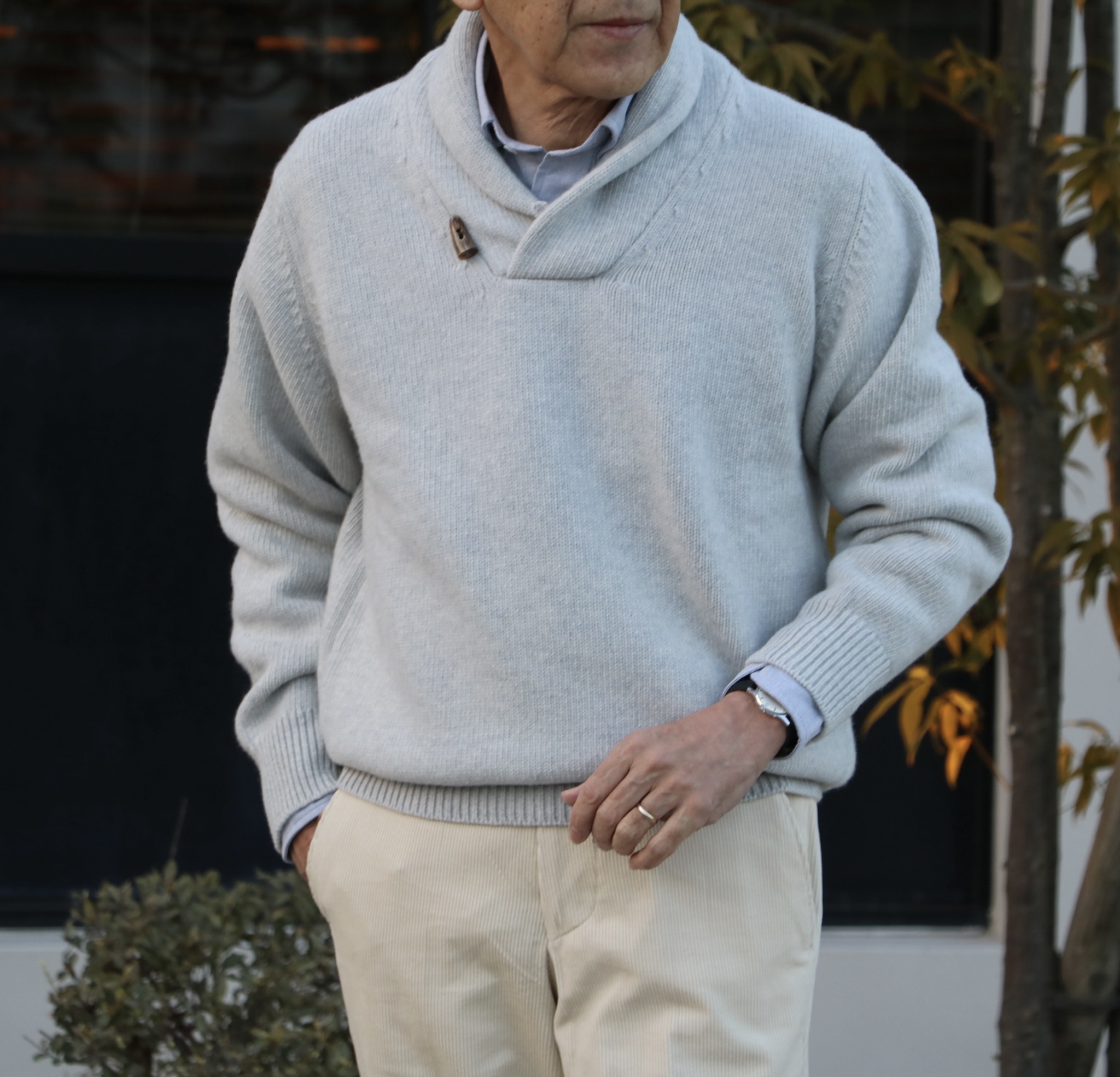 着用サイズはM。ショールカラーのプルオーバーと比べるとタイトな作りです。実はカミさんがサイズSをクリスマス前に購入。寒い日には必ず、このニットと本日も着ておりました。さすがにペアルックでは申しありません。このニットは諦めることにしておりますが、もし、もしも在庫として残るようであれば、もしかすると…です。税込価格176000円とショールカラープルオーバーと同じ。こちらも未公開となります。ぜひお問い合わせください。