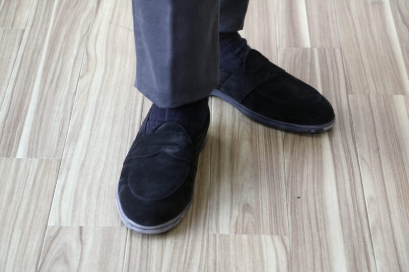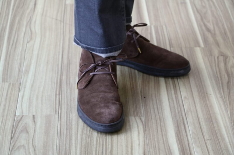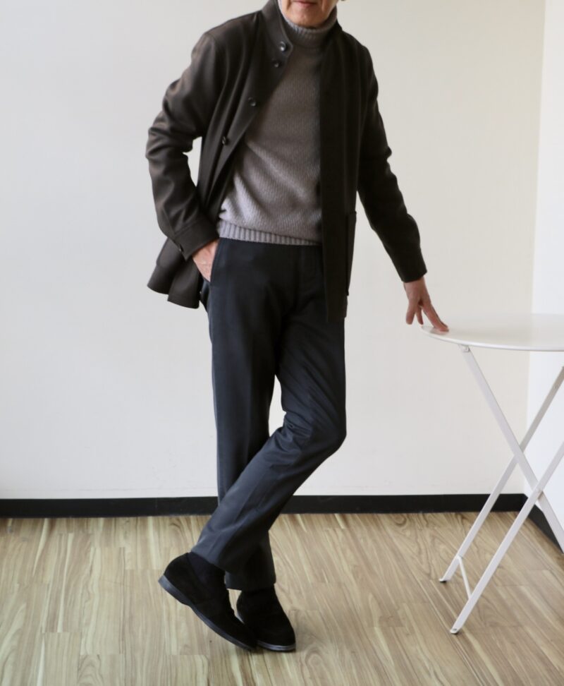 こんなスタイルでも寒くはありません。羽織ったのは、ARMA/アルマのラムスエードシャツジャケット。ボトムはJACOB COHEN/ヤコブ・コーエンのデニムパンツです。インナーのタートルネックとチャッカブーツは私物です。
